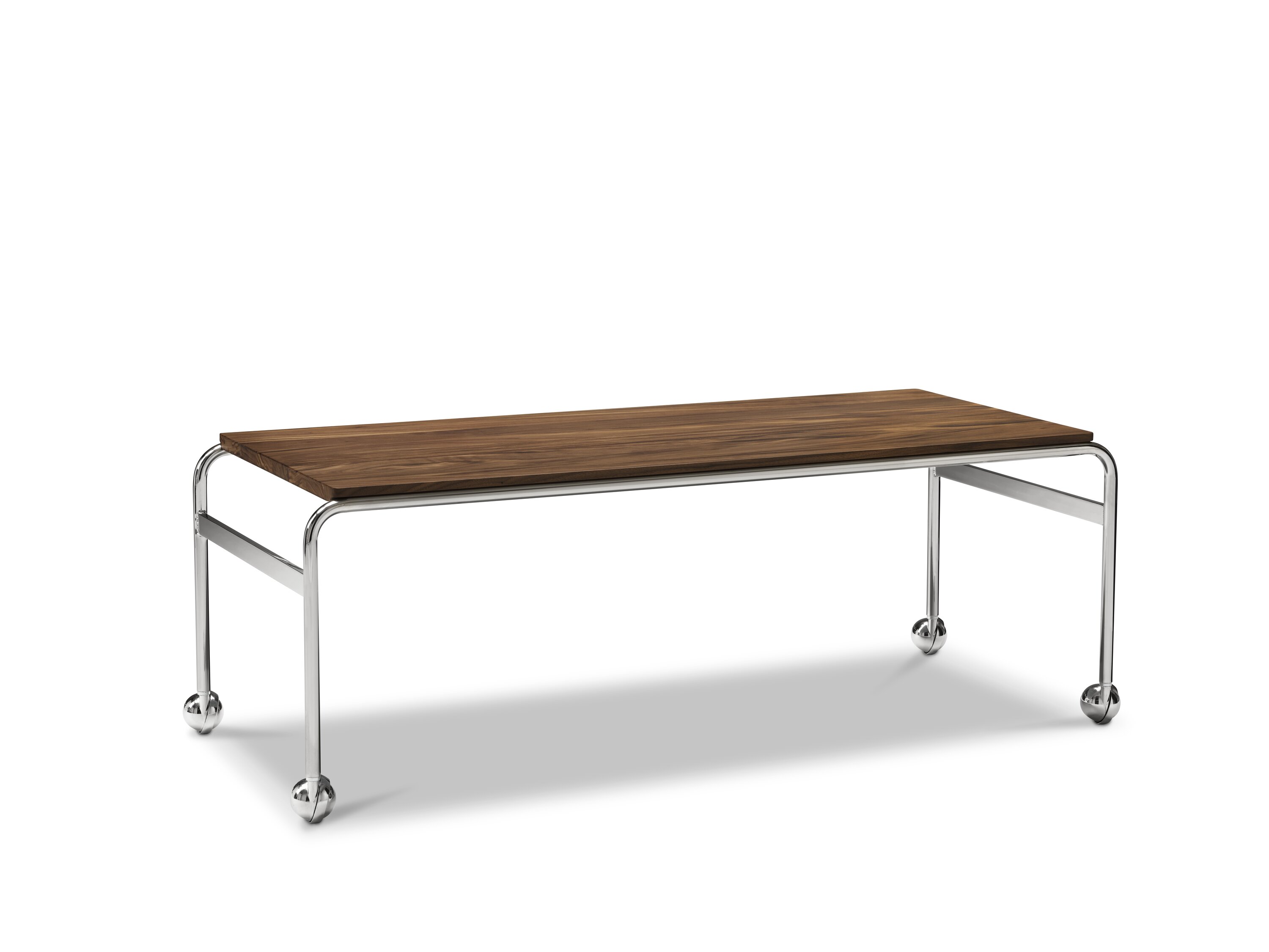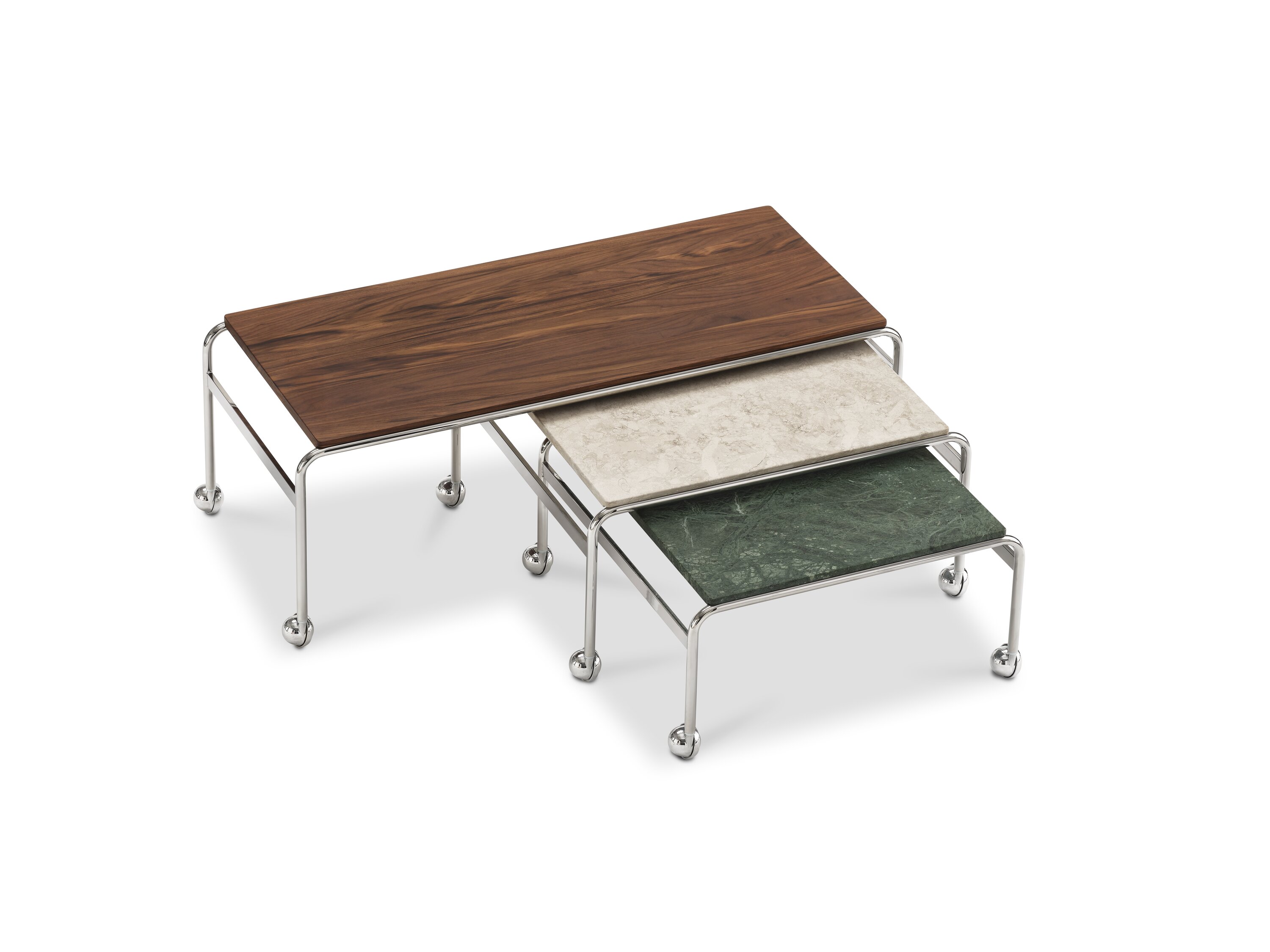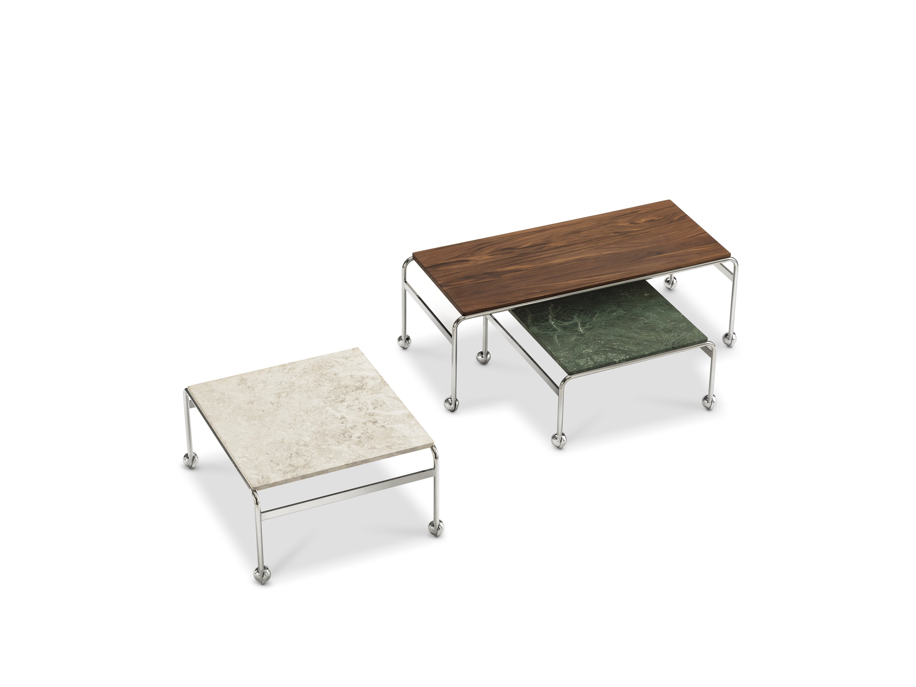 Based on Bruno Mathsson’s original table, designed to accompany his classic chair, this option provides the largest amount of surface space, but with the same elegant aesthetics of the Karin collection. The chrome-plated frame is topped in exclusive marble, limestone or walnut.